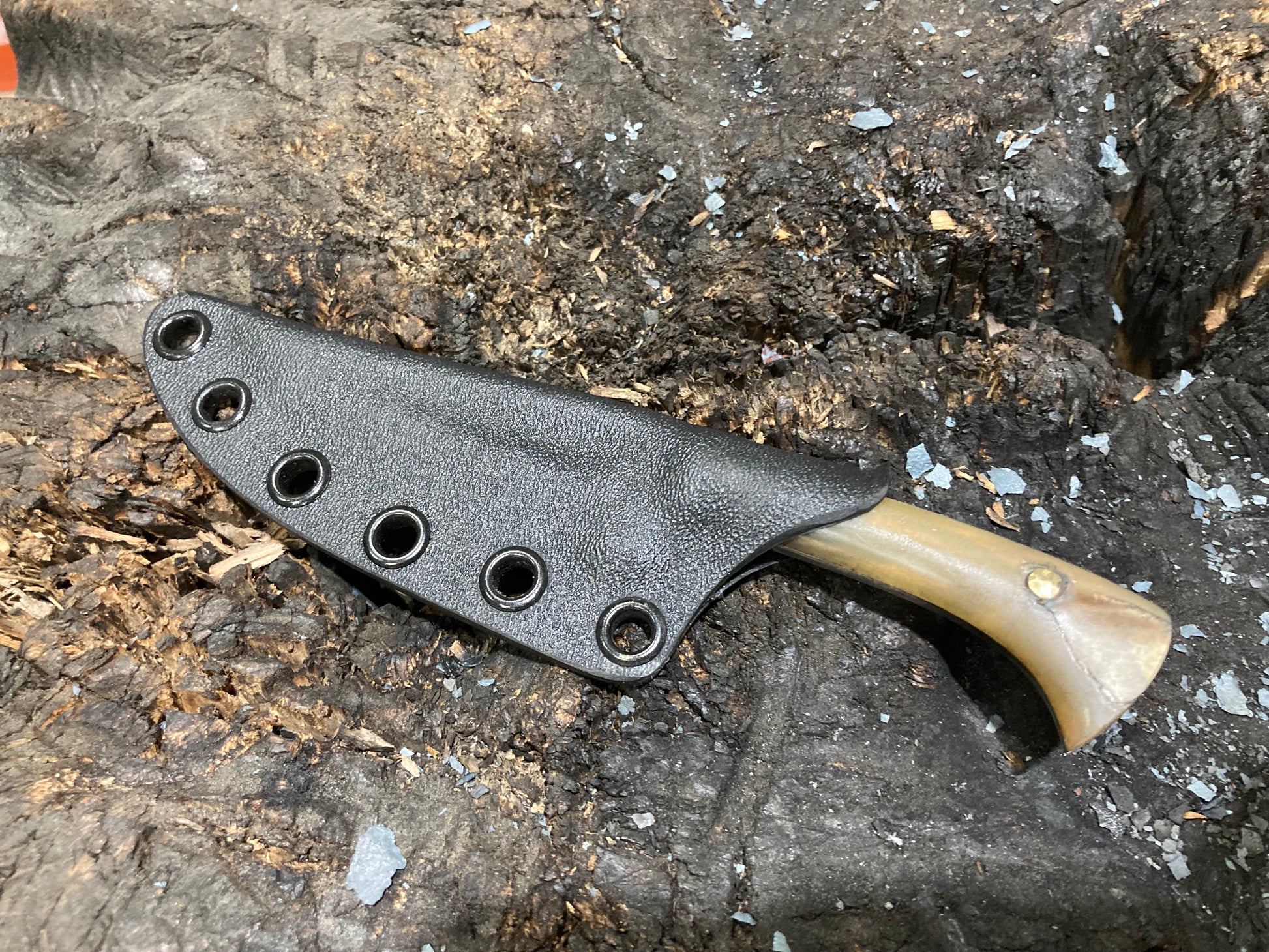 This is a design I’ve been developing for some years which I have fallen in love with as an all around daily use knife. I use these things for just about everything, including scribing material for making other knives. This one is 1095 with horn scales and riveted bronze pins, with a kydex sheath.