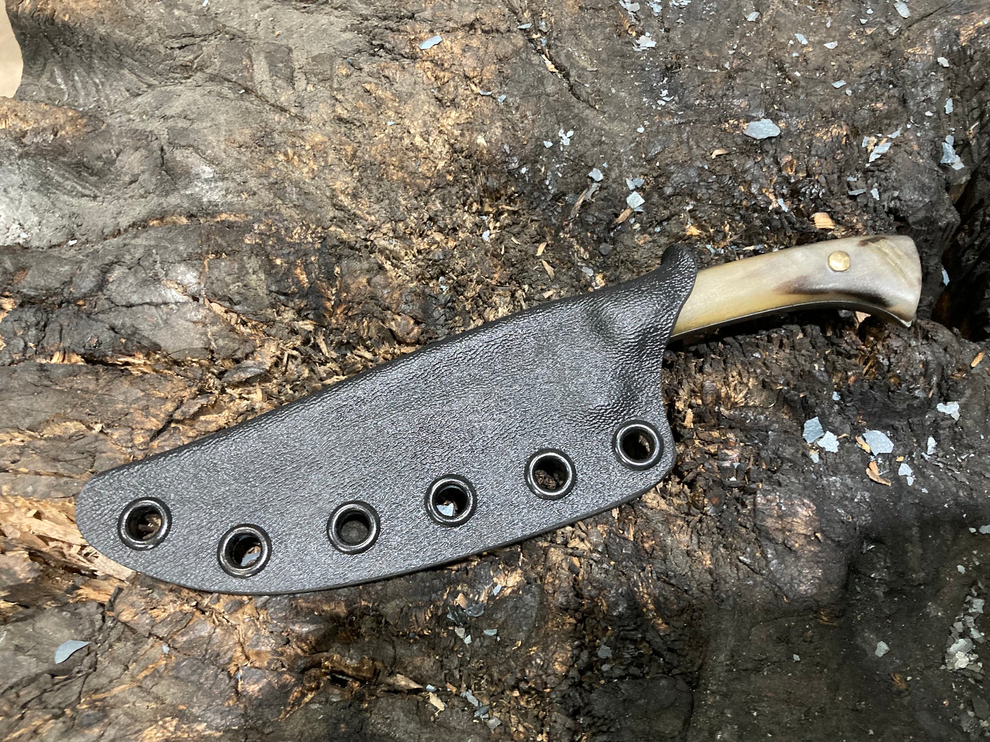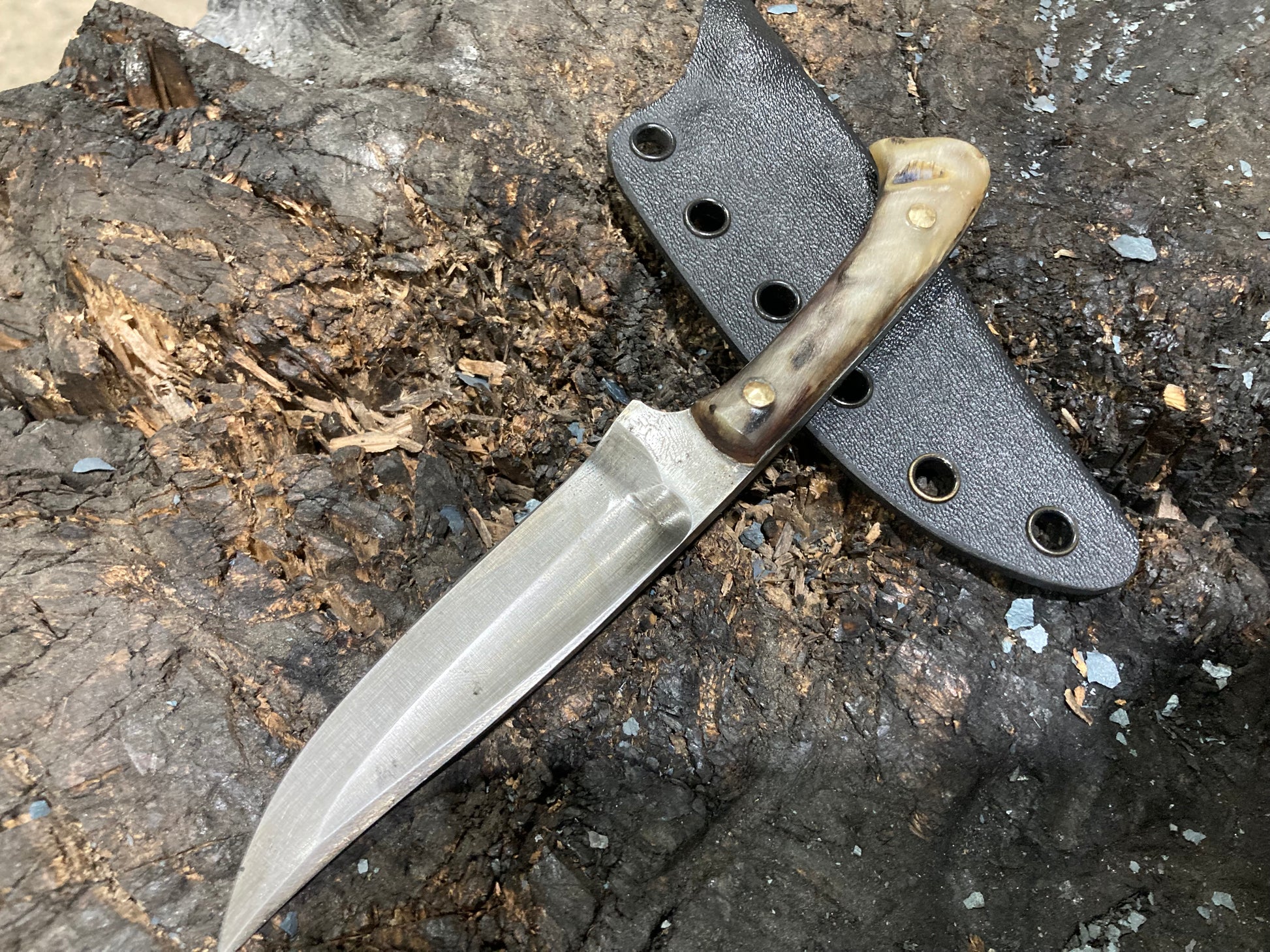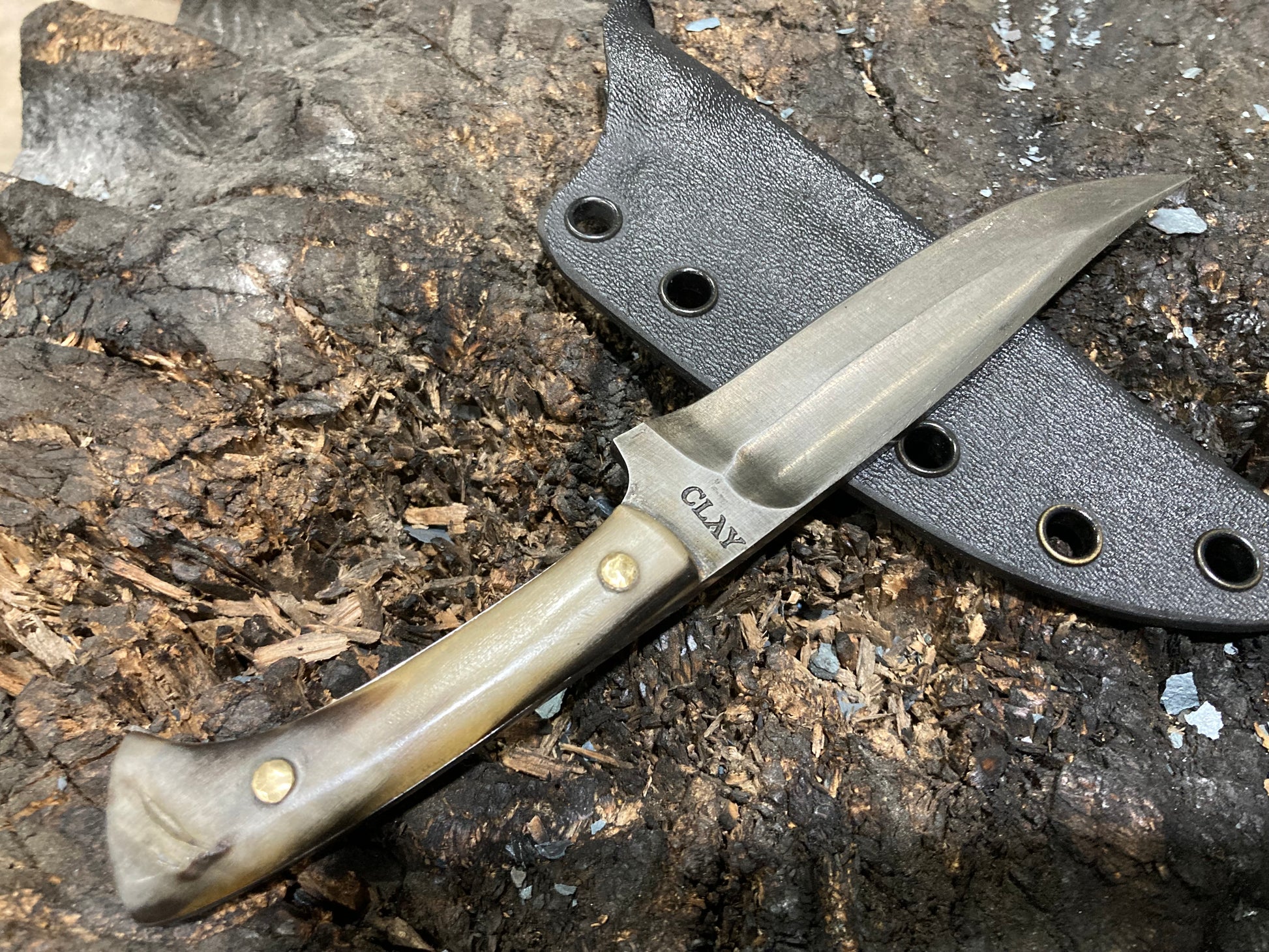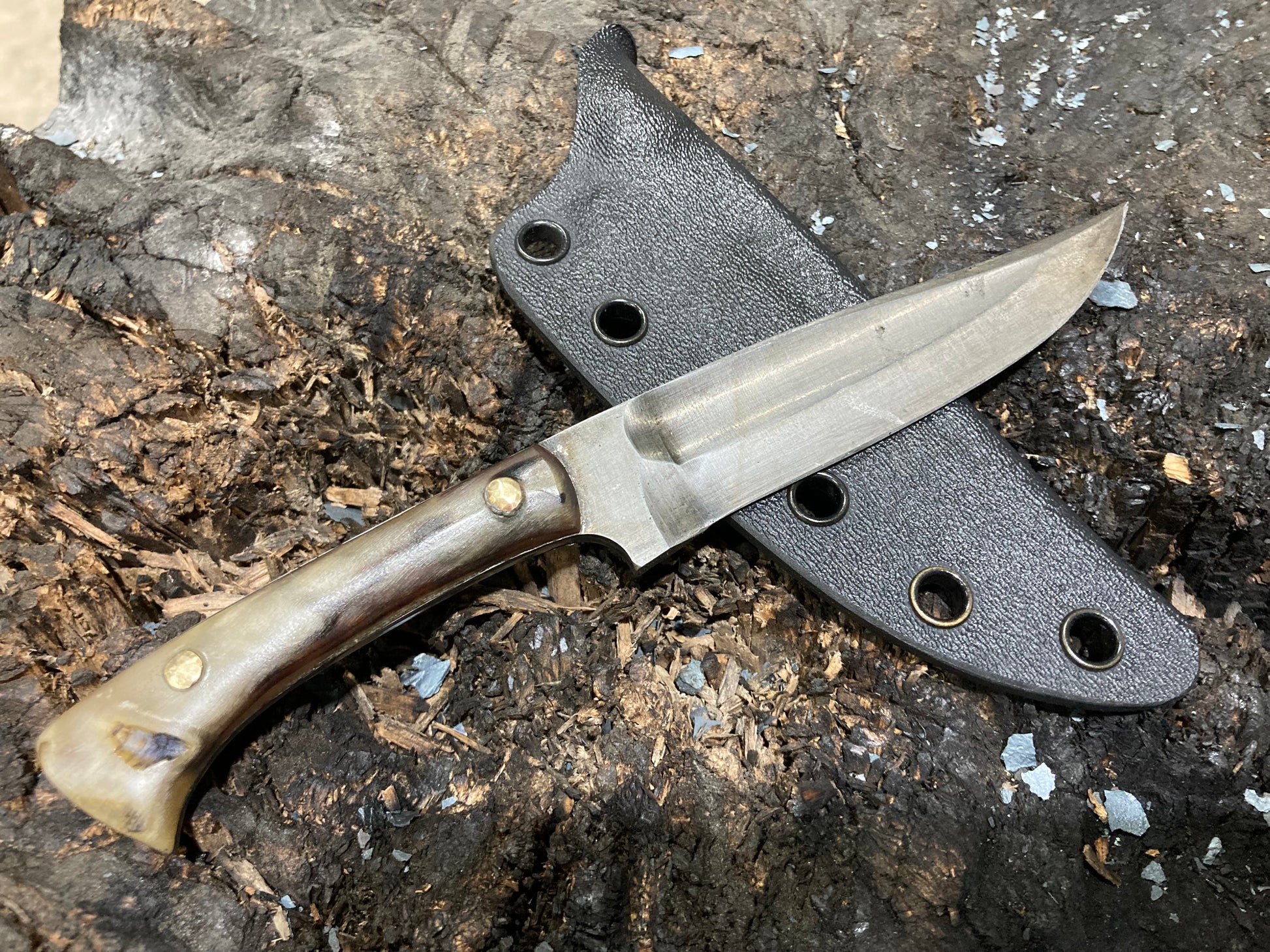This is a design I’ve been developing for some years which I have fallen in love with as an all around daily use knife. I use these things for just about everything, including scribing material for making other knives. This one is 1095 with rams horn scales and riveted bronze pins, with a kydex sheath.