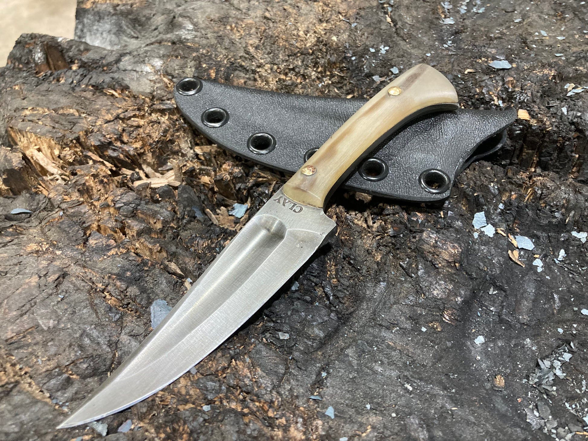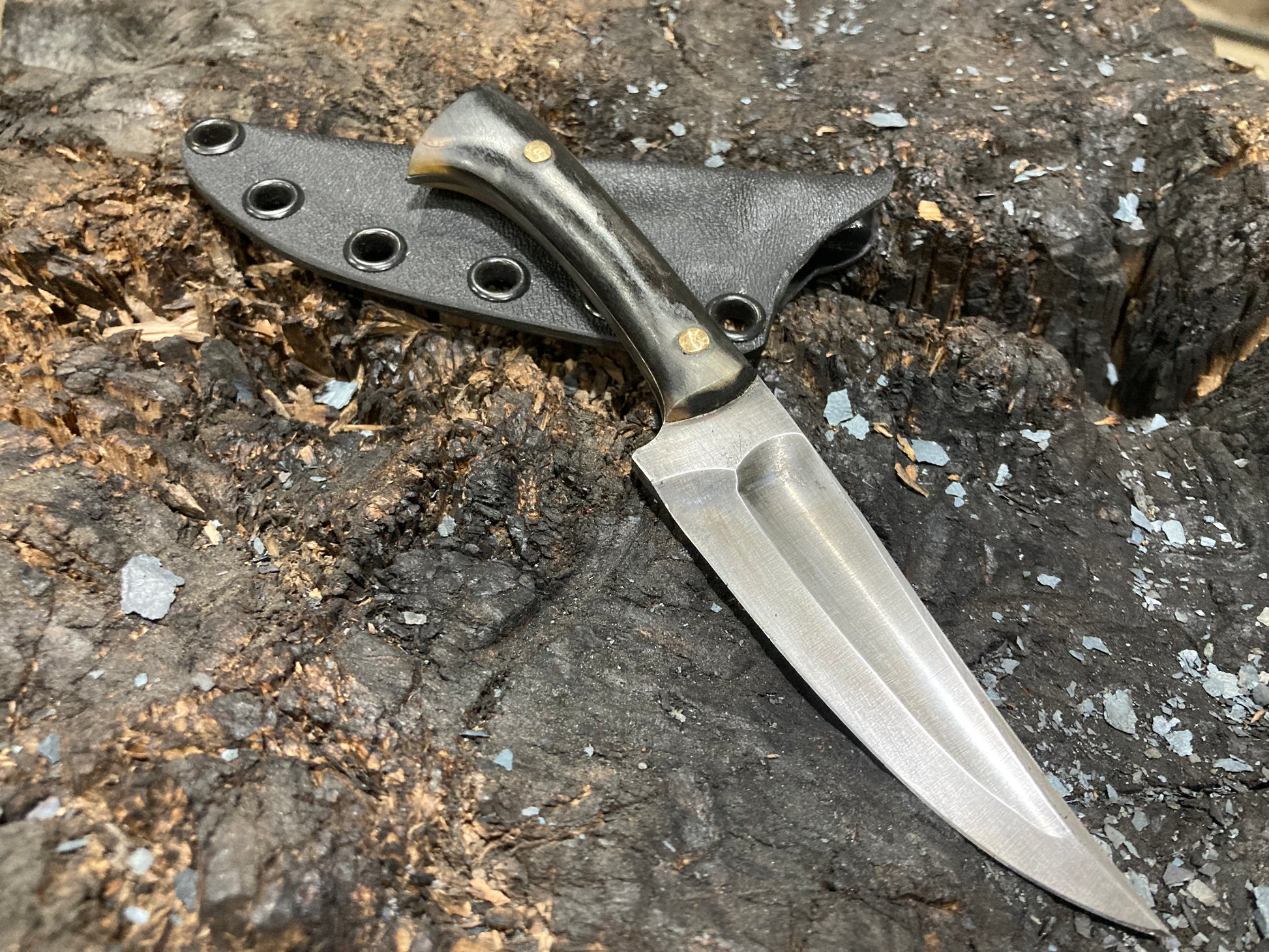 This is a design I’ve been developing for some years which I have fallen in love with as an all around daily use knife. I use these things for just about everything, including scribing material for making other knives. This one is 1095 with rams horn scales and riveted bronze pins, with a kydex sheath.