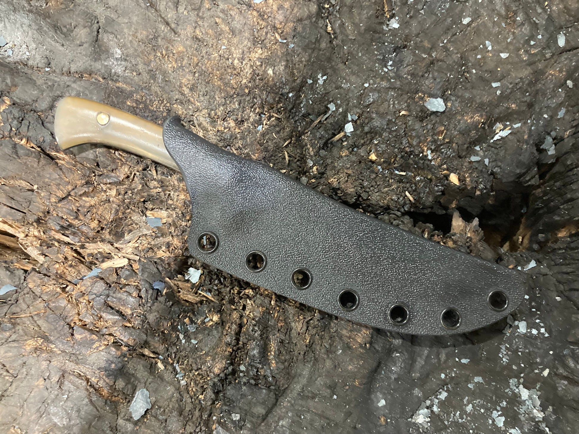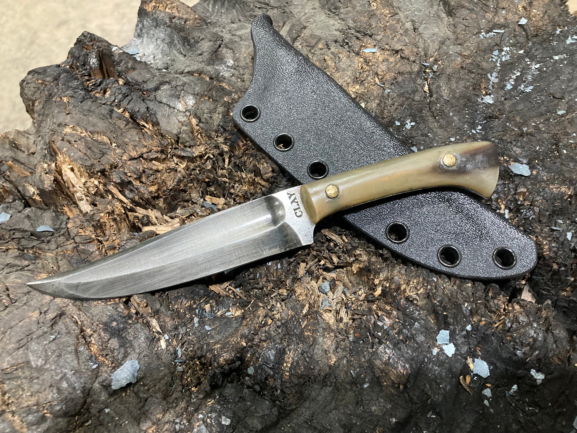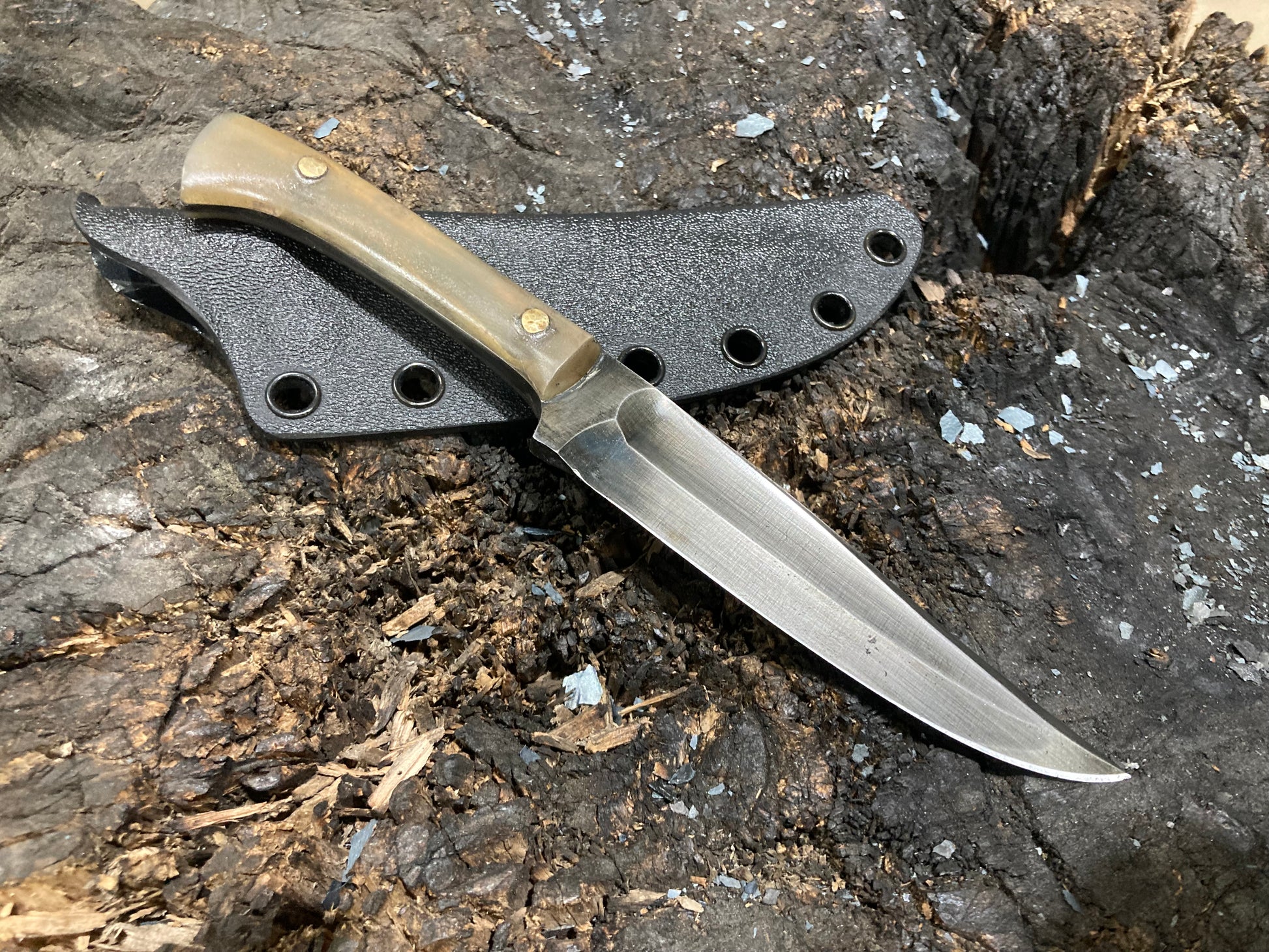 This is a design I’ve been developing for some years which I have fallen in love with as an all around daily use knife. I use these things for just about everything, including scribing material for making other knives. This one is 1095 with horn scales and riveted bronze pins, with a kydex sheath.